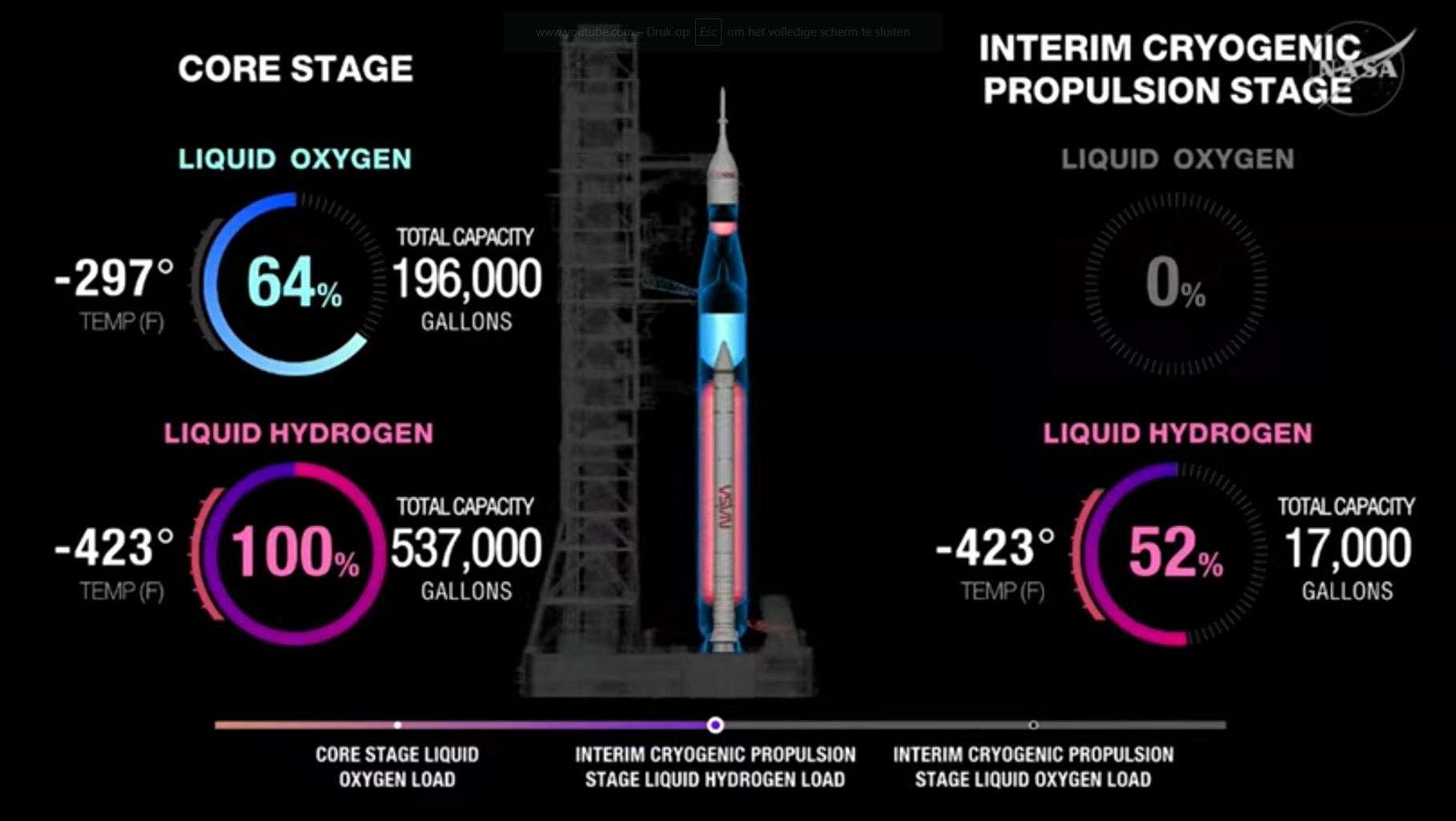 19.02 - 18u27 – Alleen maar goed nieuws Upper Stage (ICPS) LH2 fast fill underway, Core Stage fueling progressing (met een Core Stage waterstoftank al meer dan 70% gevuld).