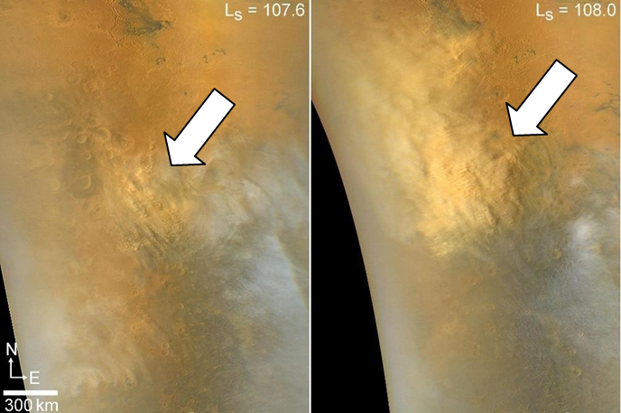 22 augustus 2023 op Ls = 108,0° (rechts), met een omvang van 1,2 × 10⁶ km². (Ls staat voor zonnelengte en geeft aan in welk deel van zijn omloopbaan Mars zich bevindt, hier is dat de noordelijke zomer.)