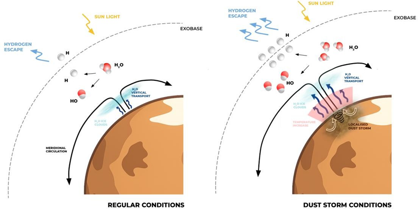 stofstorm het verticale transport van waterdamp vanuit de lagere atmosfeer, waardoor water op grotere hoogte wordt geïnjecteerd en waterstof uit de exobasis ontsnapt.