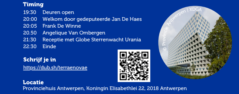 Van satellietnavigatie tot klimaatmonitoring: Europese ruimtevaart is overal. Tijd om te zien hoe dichtbij “ver weg” eigenlijk is. De ruimte is de last frontier en spreekt dan ook tot de verbeelding. Welke rol speelt Europa hierin? Op 19 december ontdek je er alles over in het Provinciehuis én kun je in het mobiel Planetarium van Urania genieten van een wonderbaarlijke reis langs de sterrenhemel.